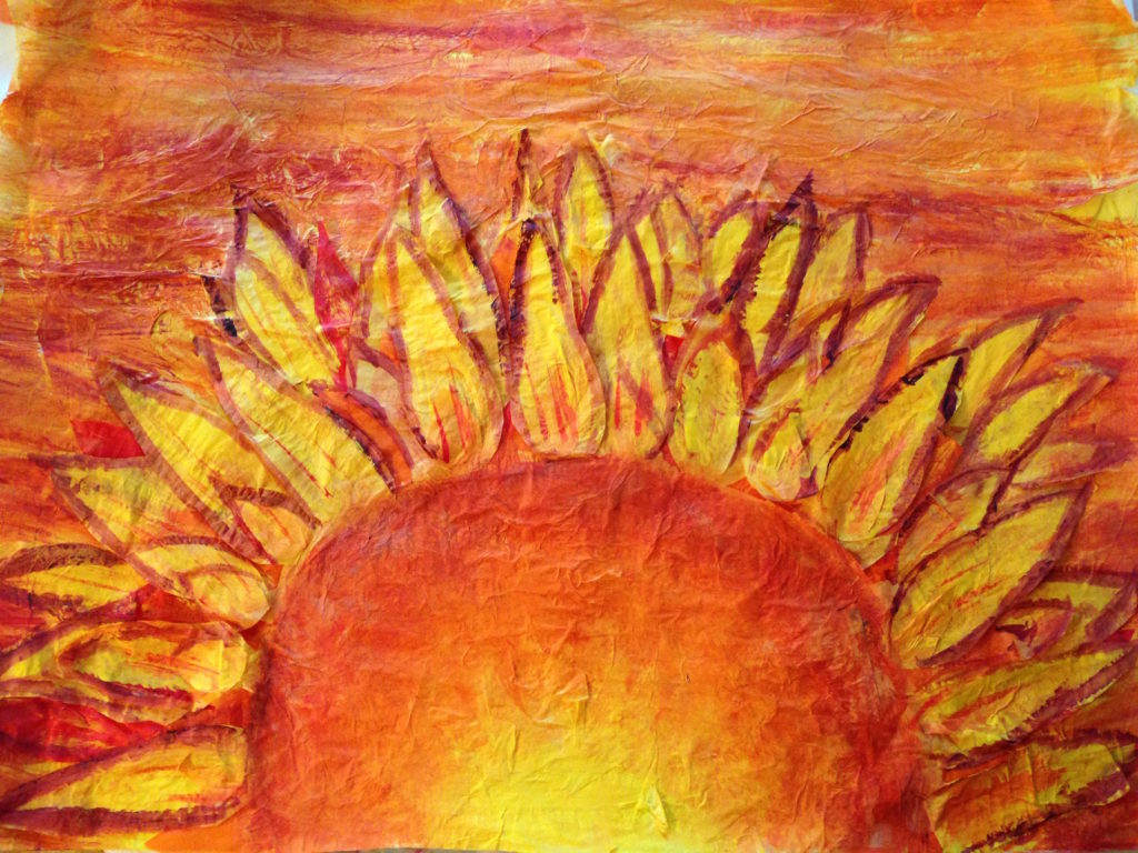 I would make the flames by cutting out pieces of colored, pattered fabric and then glue it onto a red board that would wrap around the entire book and be the core of the jacket. That red board, for the front and back, was glued onto a stiffer board that would make it sturdier.